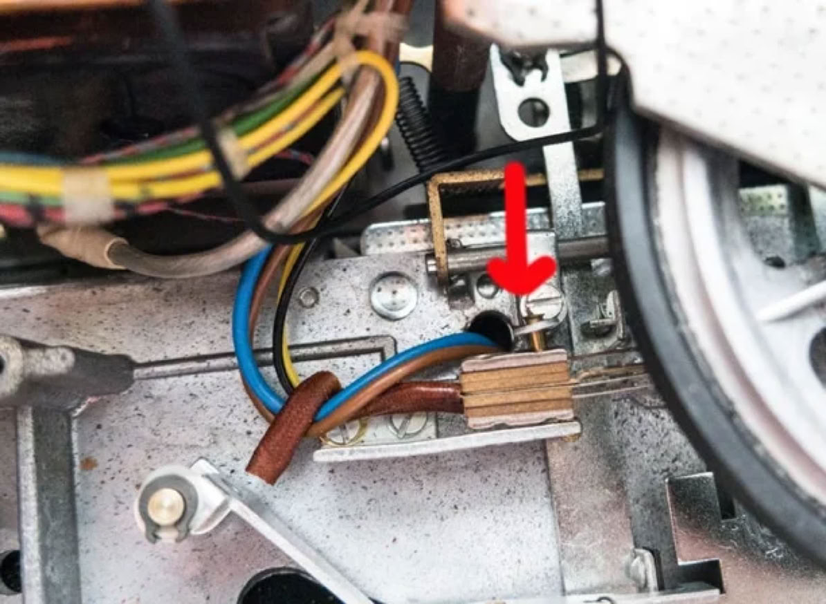 Nach der Reparatur mit Schraube 1.4 und Mutter. Unterlagscheibe nicht vergessen! Die Justierung erfolgt durch Verbiegen des Blechs oberhalb der Mutter.