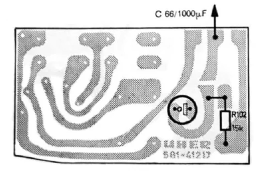 Als Messausgang für Kanal 2 dient der Kontakt der Buchse „Lautsprecher“ Kanal 2, wenn die Verbindung zwischen C66 und der Buchse gelöst und nunmehr eine Verbindung mit Buchse und R102 hergestellt wurde. Als Massepunkt dient der Kontakt 2 der Buchse „Radio/Phono“. Nach erfolgten Messungen Originalschaltung wiederherstellen.