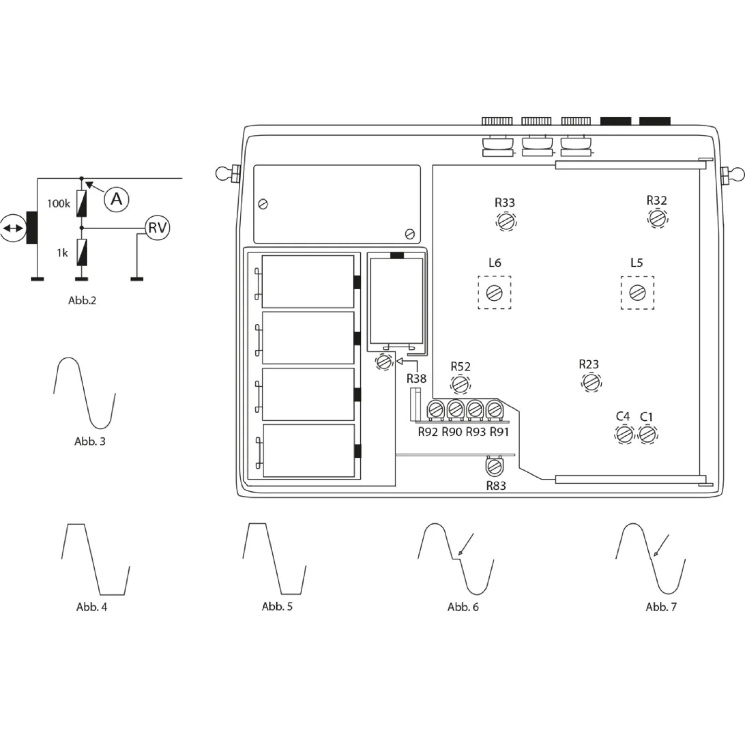 Regler R 92 so einstellen, dass die seitliche Verschiebung zwischen den beiden Halbwellen ein Maximum wird (siehe Abb. 6). Dazu R 92 langsam zurückdrehen, bis die seitliche Verschiebung gerade verschwunden ist, d. h. ein glatter Obergang zwischen den beiden Halbwellen besteht (siehe Abb. 7).