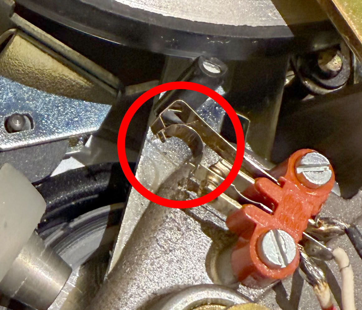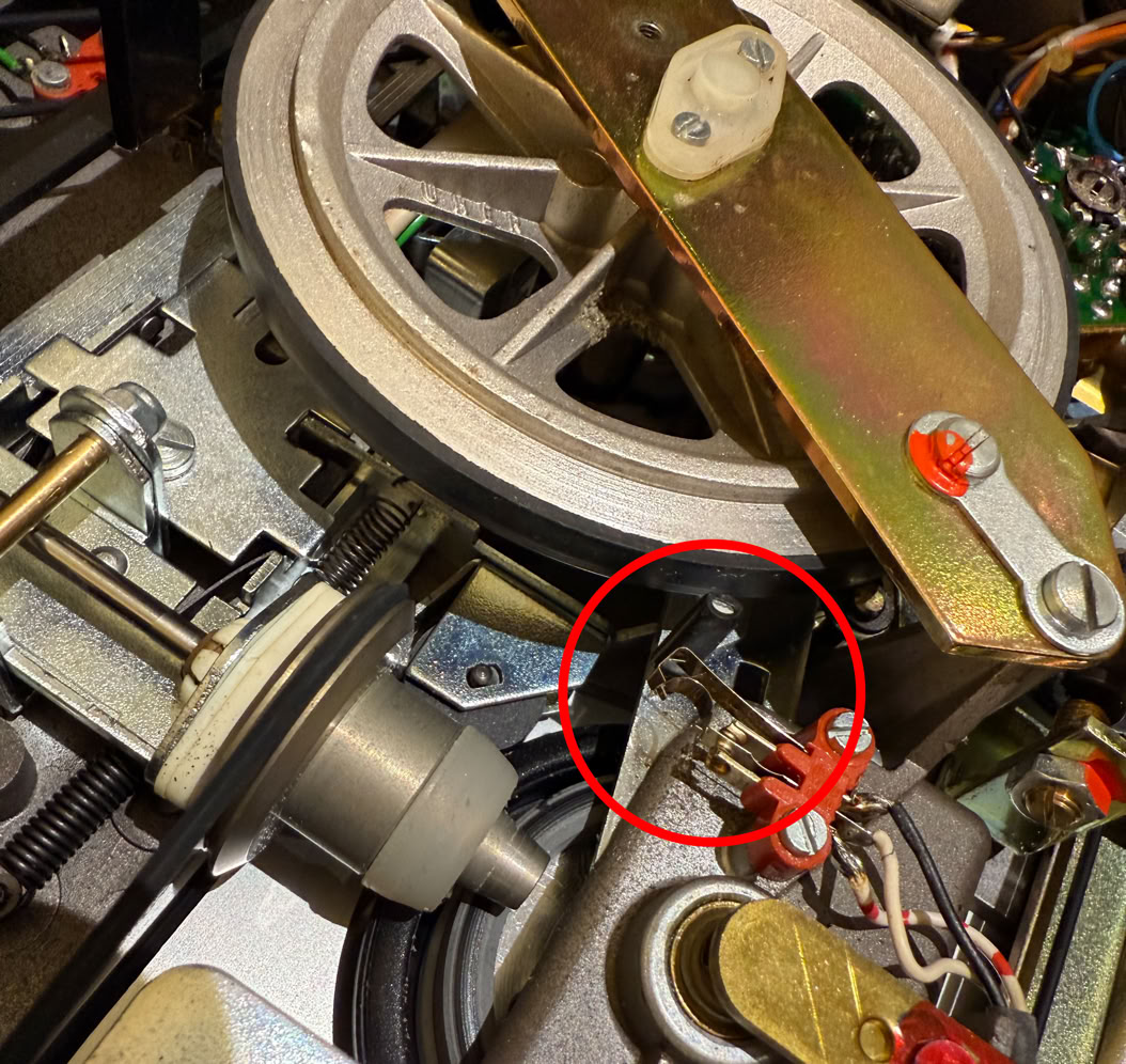 Kontrolle: Band starten und beim Mikroschalter die oberen Kontakte (rote Umrandung auf folgendem Foto) mit einem kleinen Schraubendreher überbrücken.