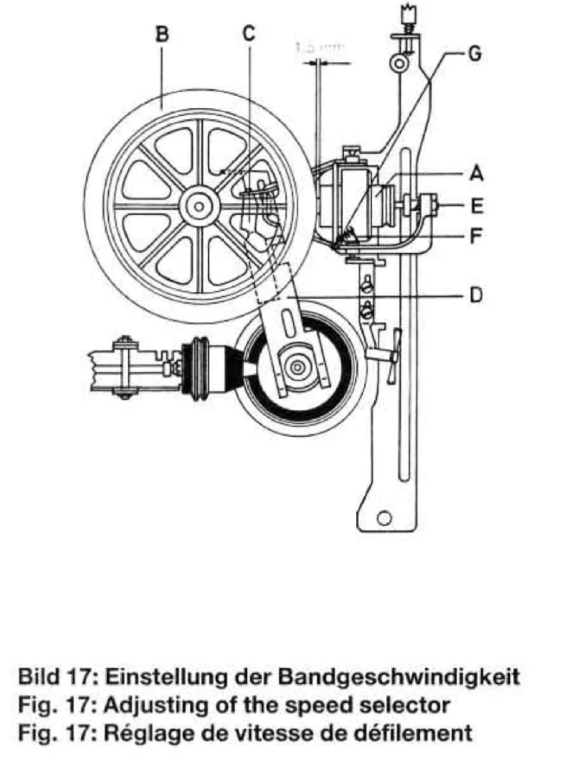 Achtung: Die Geschwindigkeitsumschaltung darf nur so weit zur rechten Gehäuseseite verschoben werden, daß bei Bandgeschwindigkeit 4,7 cm/s der Gummibelag des Antriebsrades mit der gesamten Fläche auf der entsprechenden Abstufung der Schwungmasse aufliegt!