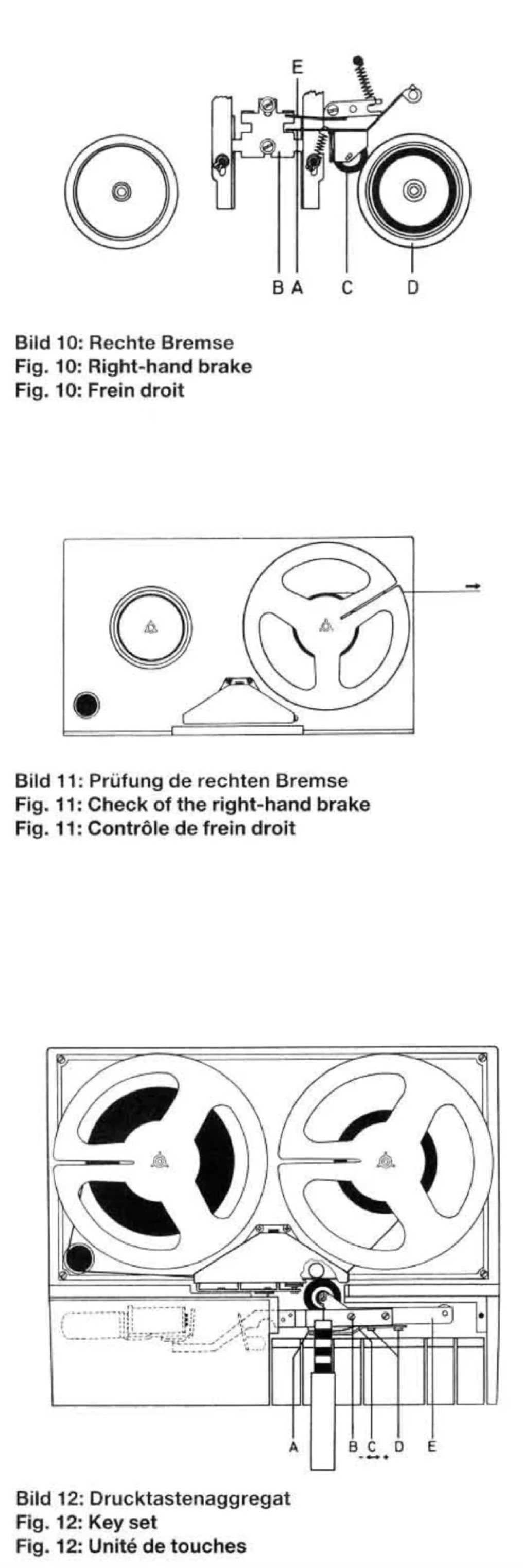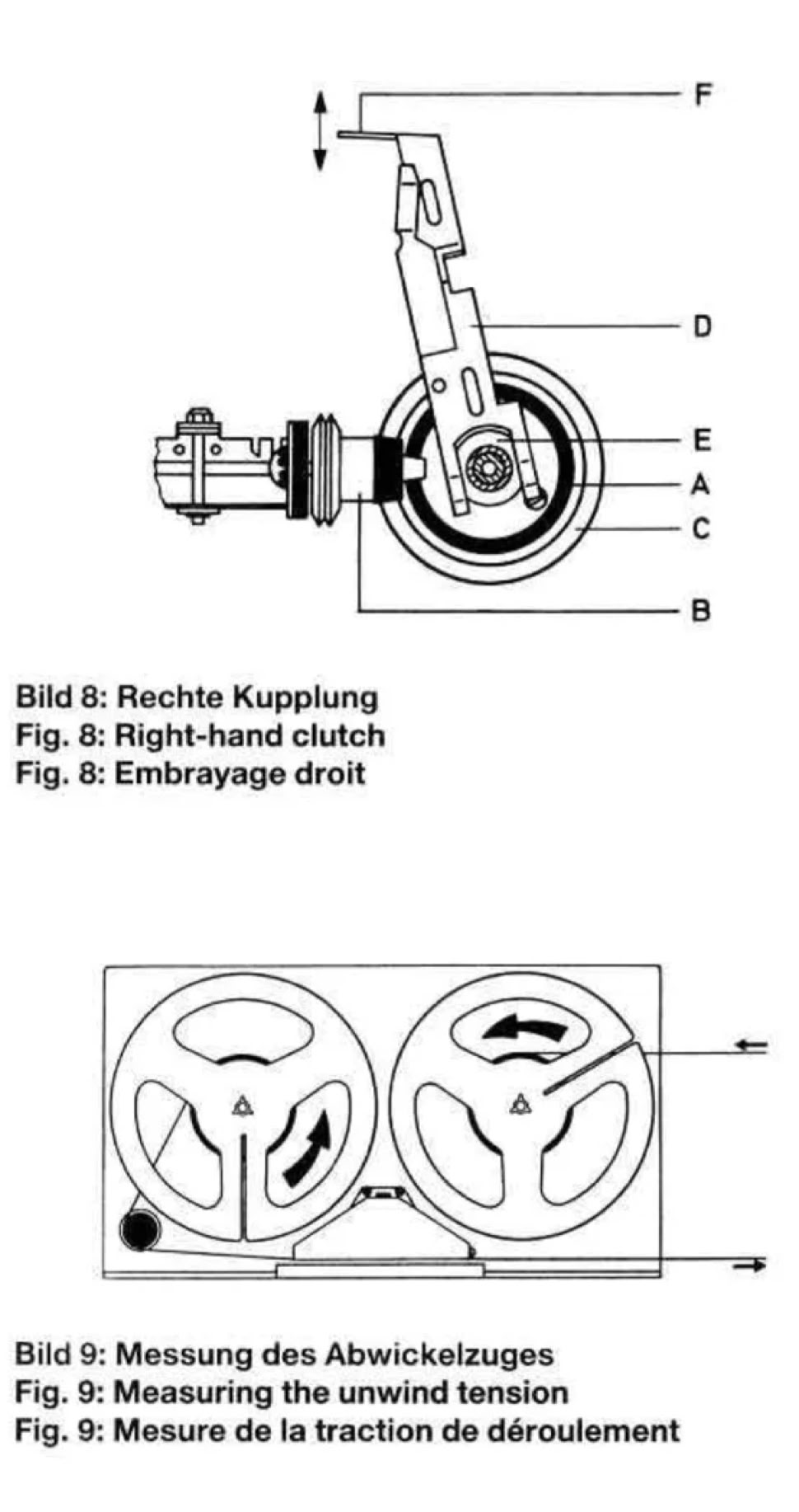 Die Prüfung der linken Kupplung erfolgt durch Messen des Abwickelzuges. Auf die linke Kupplung wird eine 13-cm-Spule (Kerndurchmesser 45 mm) aufgelegt, die mit ca. 50 cm Tonband bewickelt ist. Das Tonband wird über die Führungsrolle der Bandzugregelung geführt und in Stellung »STOPP« In Pfeilrichtung (siehe Bild 9) mit einer Federwaage abgezogen.