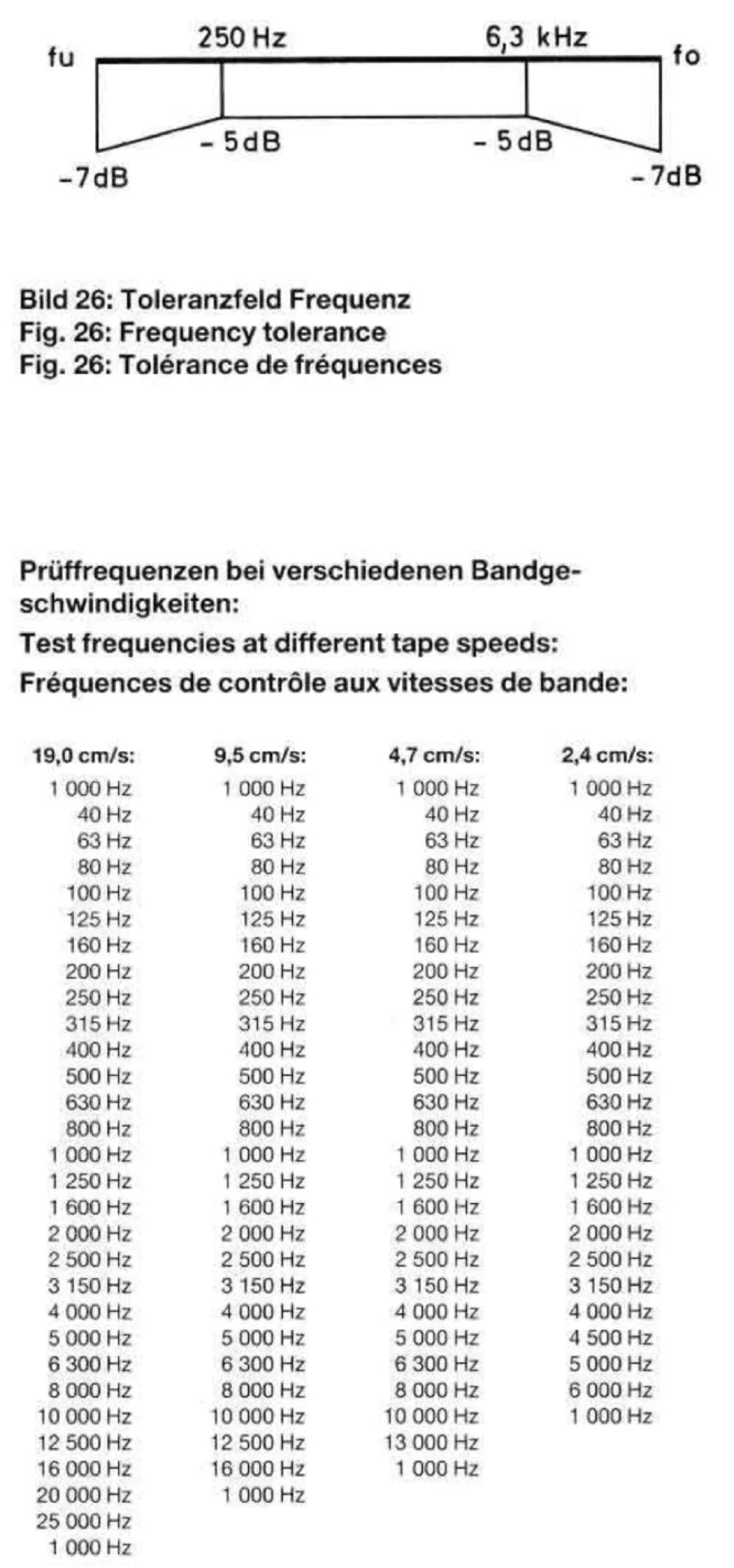 Nach einer Veränderung des Vormagnetisierungsstromes muss kontrolliert werden, ob der Gesamtfrequenzgang innerhalb des Toleranzfeldes nach DIN 45 500, Blatt 4 liegt (siehe Bild 26).