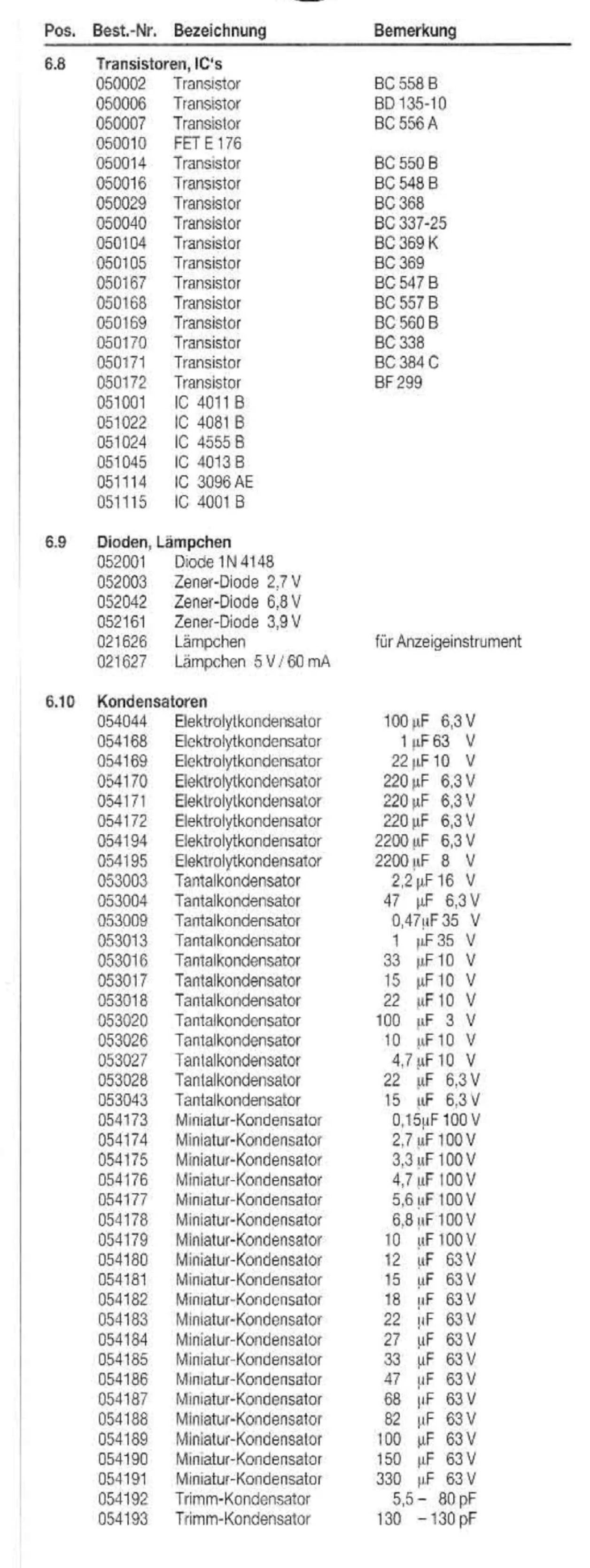 Mit Ausnahme einiger einzelner Bauteile befindet sich die Mehrzahl der elektrischen Bauteile auf den Leiterplatten. Im Stromlaufplan (s. Kap. 5) sind grundsätzlich alle auf einer Leiterplatte vereinten Bauelemente wie Widerstände, Kondensatoren und Dioden fortlaufend nummeriert.