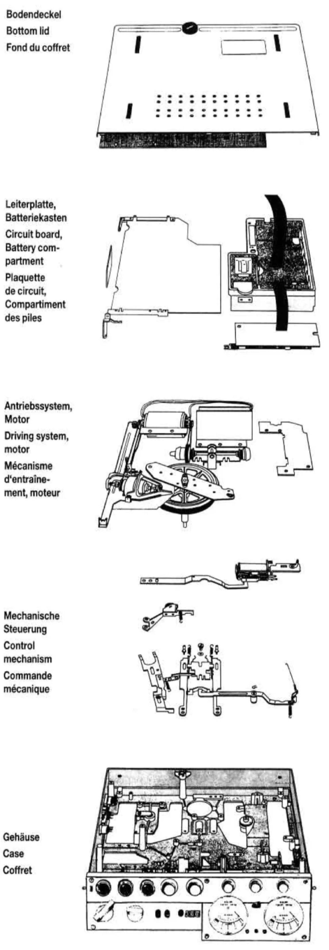 Zwei weitere Leiterplatten sind durch Direktsteckung mit der Grundplatte verbunden: Die Leiterplatte mit Kennziffer 1100, die mit den Bandgeschwindigkeiten umschaltbar nach der in NARTB-Norm aufgelösten Wiedergabe- Entzerrung, sowie die Leiterplatte mit Kennziffer 1000 für die umschaltbare Aufnahme-Entzerrung. Nach Lösen der Befestigungsschraube auf der Widerlagerschiene für das Antriebsrad, kann die ganze Einheit ausgeschwenkt werden und bleibt dabei voll funktionsfähig.