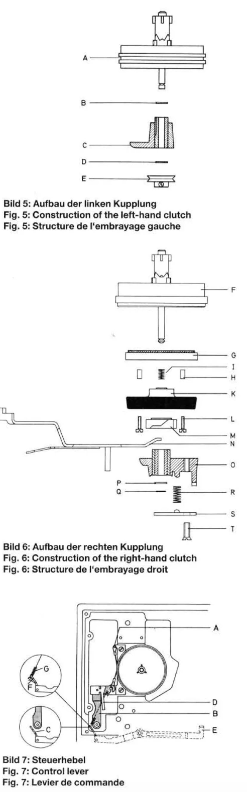 Die Welle (!) mit den Friktionsrädern (G und H} ist in der Wippe (N) gelagert. Die Wippe wird über ein Gestänge betätigt und bringt die Friktionsräder mit den Kupplungsoberteilen in Friktion. Dadurch werden der schnelle Vorlauf und Rücklauf in Tätigkeit gesetzt. Die Kupplungen sind als Reibungskupplungen ausgeführt. Damit ist das Mitnahme moment nahezu über die gesamte Bandlänge konstant. Die Kupplungen arbeiten lageunabhängig und enthalten eine Arretierungsvorrichtung, mit der die Bandspulen gegen ein Herabfallen gesichert sind. Die Bremsung des Kupplungsoberteiles (M) erfolgt über die Klemmrolle (O), die in angedrücktem Zustand zwischen das Kupplungsoberteil und die Zunge (P) geklemmt wird.