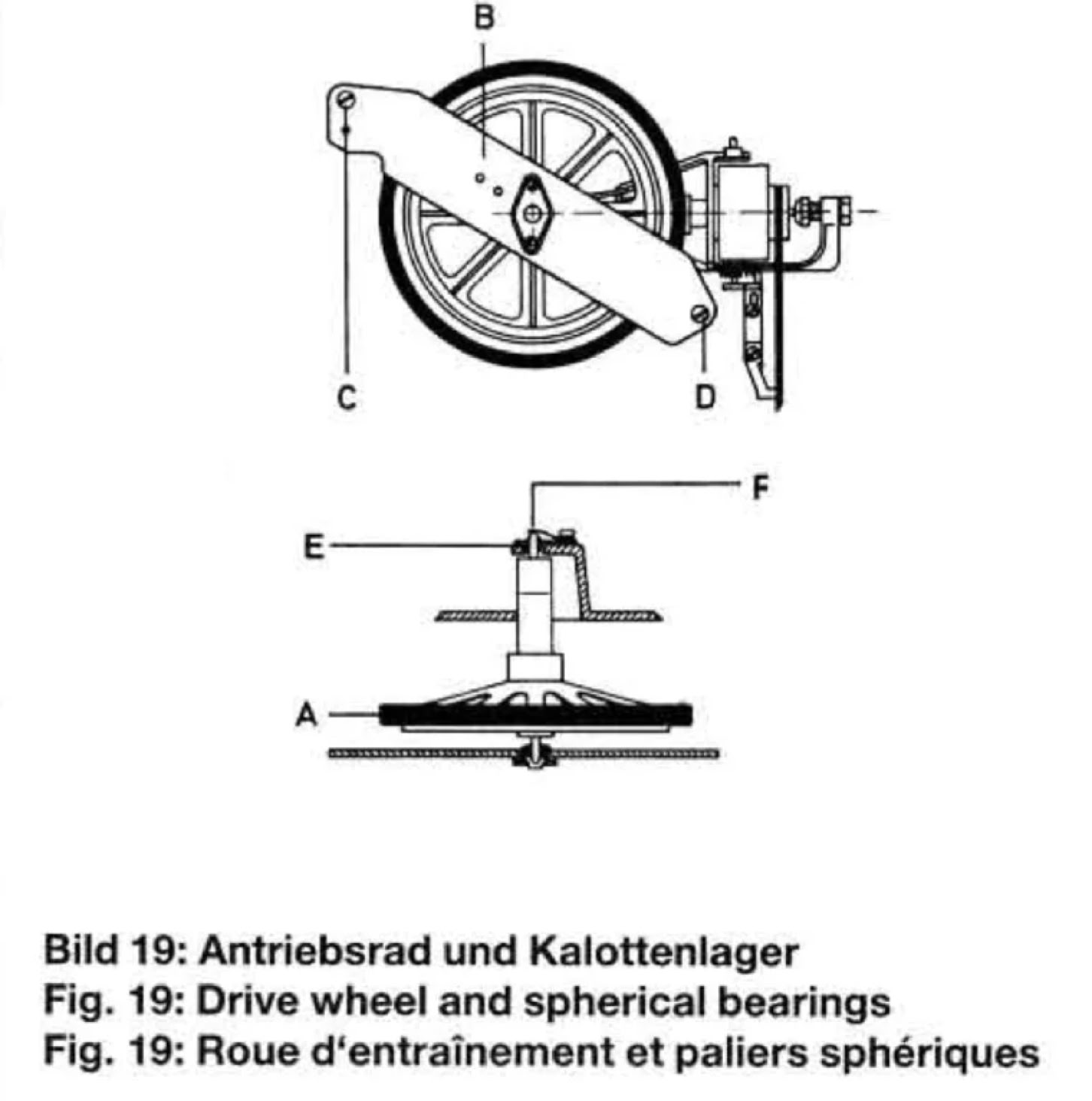 Der elektronisch geregelte Motor (A) treibt über den Riemen (B) die Schwungmasse (C) an. Die Schwungmasse ist entsprechend der Bandgeschwindigkeit mit vier Stufen versehen und schwenkbar gelagert. Sie dreht sich bei allen Bandgeschwindigkeiten gleich schnell.