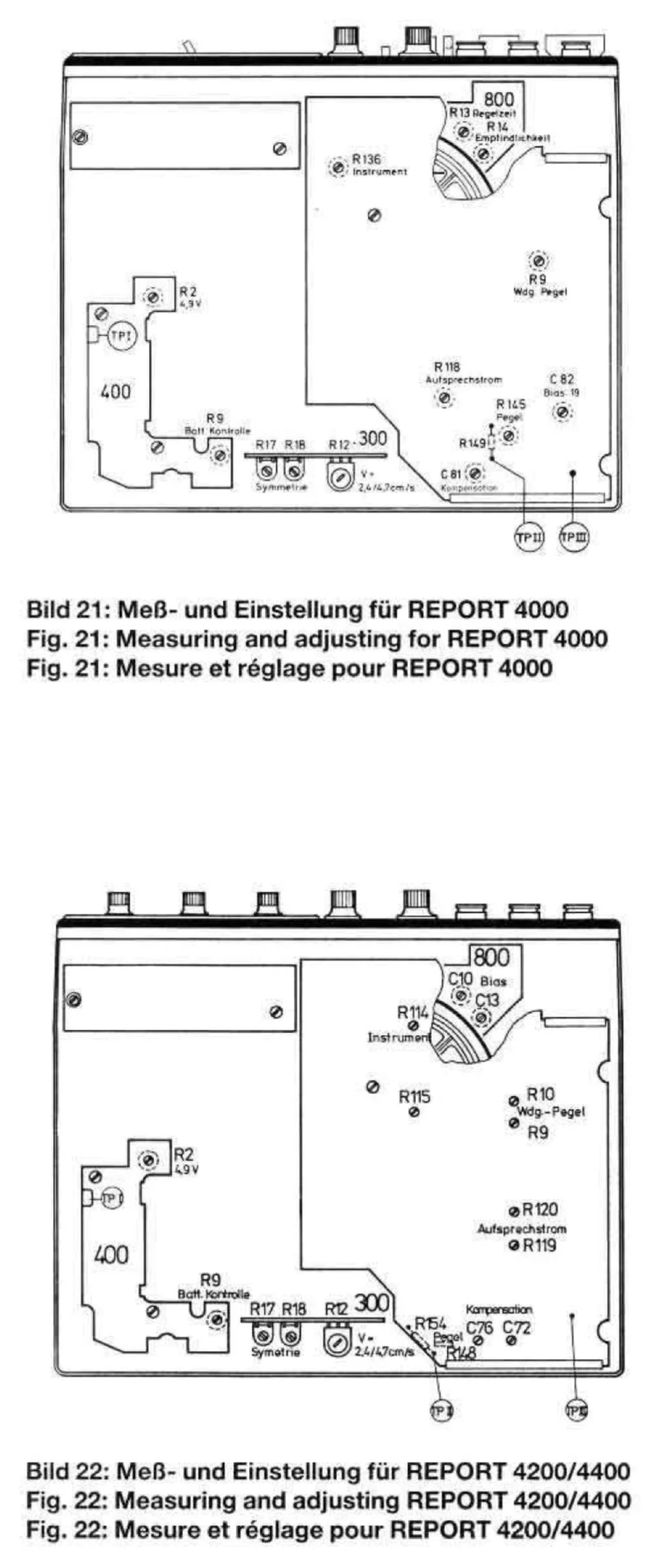 Die beiden Endstufen befinden sich auf der Leiterplatte mit der Kennziffer 900 und der Stereo-Signaleingangsverstärker auf der Leiterplatte mit der Kennziffer 1200. Auch beim 4200 und 4400 Report Monitor ist die Motorsteuerung auf einer Platte mit der Kennziffer 300 und die zur Siebung und Stabilisierung der Versorgungsspannung dienenden Bauteile auf einer Leiterplatte mit der Kennziffer 400 zusammengefasst.