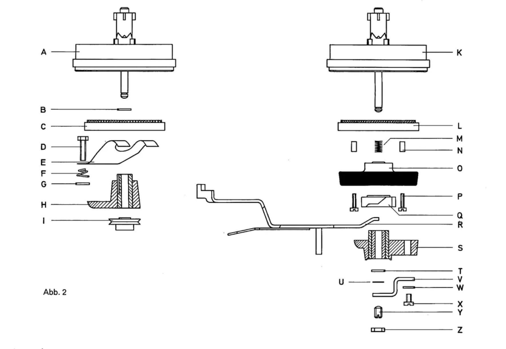 Der Aufbau der Kupplungen ist aus Abb. 2 ersichtlich. Linke Kupplung: Kupplungsoberteil (A), Unterlegscheibe (B), Anzahl nach Bedarf, Kupplungsscheibe (C) mit Filzbelag, Schraube (D), Druckfeder (E), Druckfeder (F), Scheibe (G), Sintermetalllager (H) und Antriebsrad (I). Rechte Kupplung: Kupplungsobertell (K), Kupplungsscheibe mit Filzbelag (L), Druckfedern (M), Abstandhülsen (N), Antriebsteller mit Gummibelag (O), Verbindungsschrauben (P), Kupplungshebering (Q), Steuerschieber (R), Sintermetalllager (S), Unterlegscheibe (T), Anzahl nach Bedarf, Wellensicherung (U), Winkel (V) des Widerlagers, Unterlegscheibe (W), Schraube (X), Madenschraube (Y) und Kontermutter (Z).