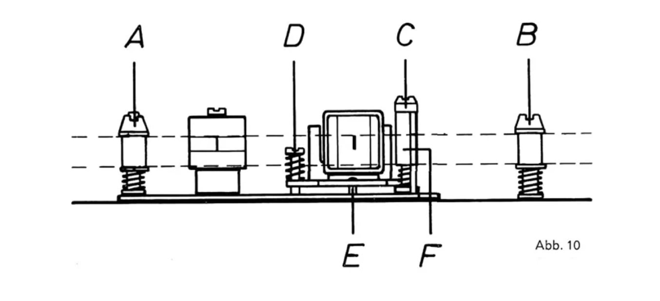 Durch Drehen der Schraube (D) kann der Tonkopf in senkrechte Lage gebracht werden. Nach der Einstellung ist die Schraube (D) mit Lack zu sichern.