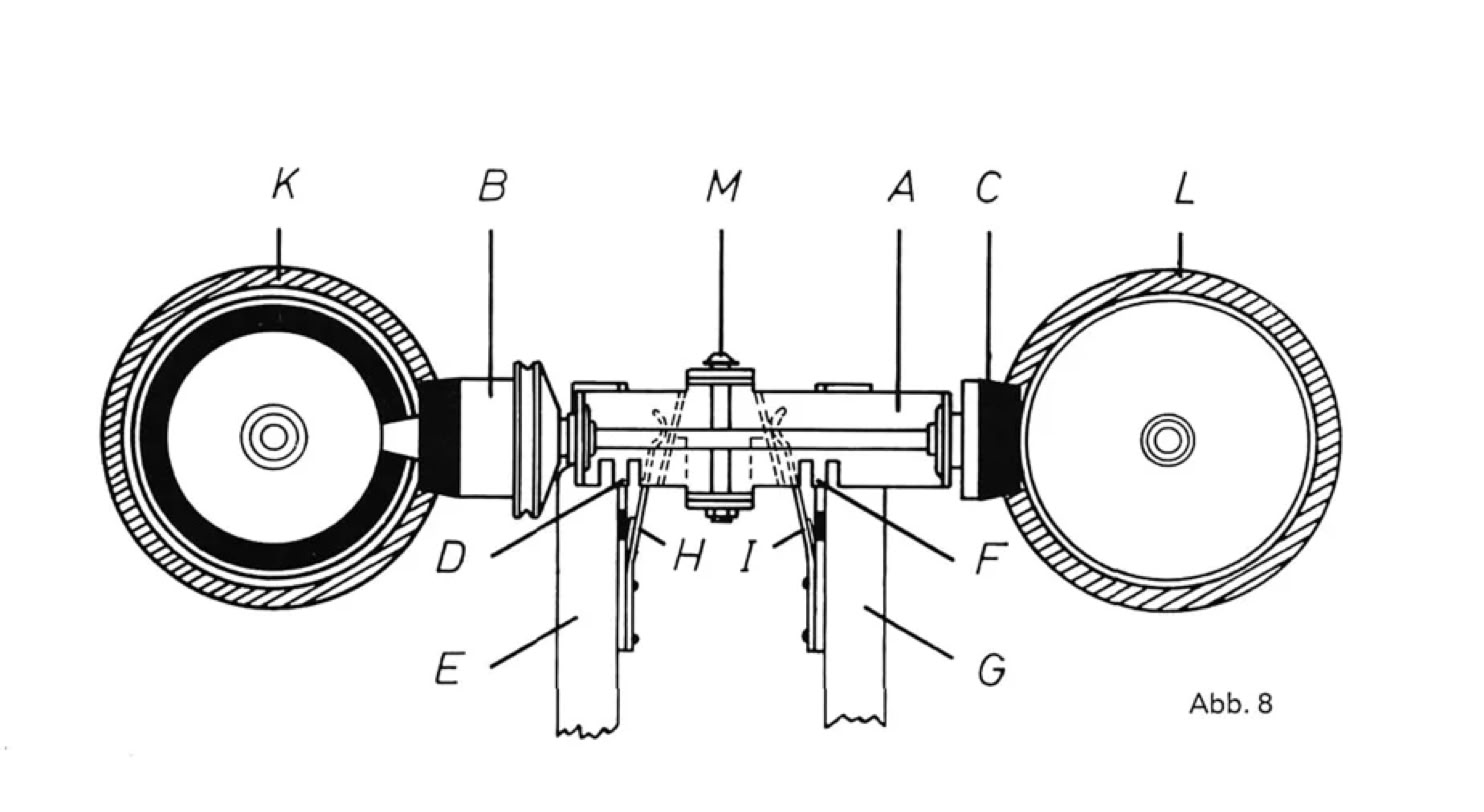 Uber den Riemen (F) werden die Friktionsräder (G) und (H), die durch die Welle (I) miteinander verbunden sind, angetrieben. Die Friktionsräder sind mit einem kegelförmig geschliffenen Gummibelag versehen. Zum Verständnis des Antriebes der Kupplung (K) muß zunächst deren Aufbau erklärt werden. Sie besteht aus dem Antriebsrad (L), einer Kupplungsscheibe mit Filzbelag und dem Kupplungsoberteil (M). in Stellung "Start" gibt ein Schieber das zum Kupplungsoberteil (M) gedrückte Antriebsrad (L) frei, 2 Federn drücken das Antriebsrad (L) gegen den kleinen Kegel des Friktionsrades (G) und die Kupplung (K) wird transportiert.