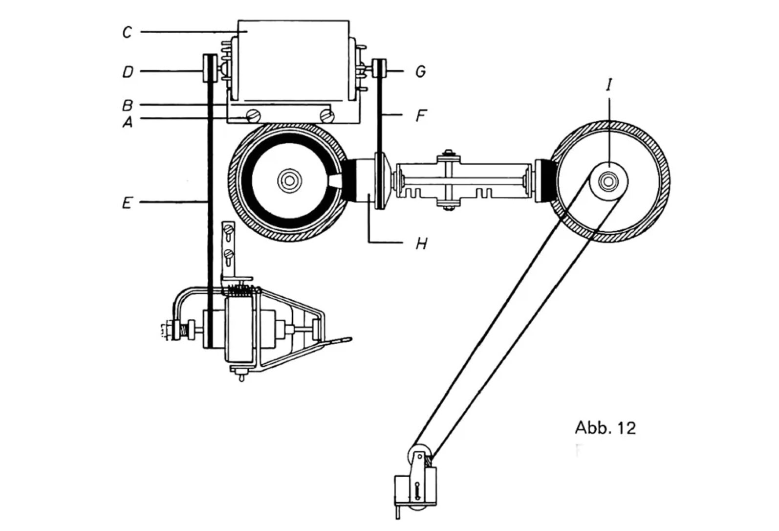 Der elektronisch geregelte Motor (A) treibt über den Riemen (B) die Schwungmasse (C) an. Die Schwungmasse ist entsprechend der Bandgeschwindigkeiten mit vier Stufen versehen und schwenkbar gelagert. Sie dreht sich bei allen Bandgeschwindigkeiten gleich schnell. Durch Friktion von Schwungmasse (C) und Antriebsrad (D) erfolgt der Antrieb der Tonwelle (E), die gleichzeitig die Achse des Antriebsrades (D) darstellt. Die Wahl der Bandgeschwindigkeiten erfolgt durch Änderung des Ubersetzungsverhältnisses zwischen Schwungmasse (C) und Antriebsrad (D). Dabei wird gleichzeitig über ein Gestänge die der jeweiligen Bandgeschwindigkeit entsprechende Entzerrung eingeschaltet.