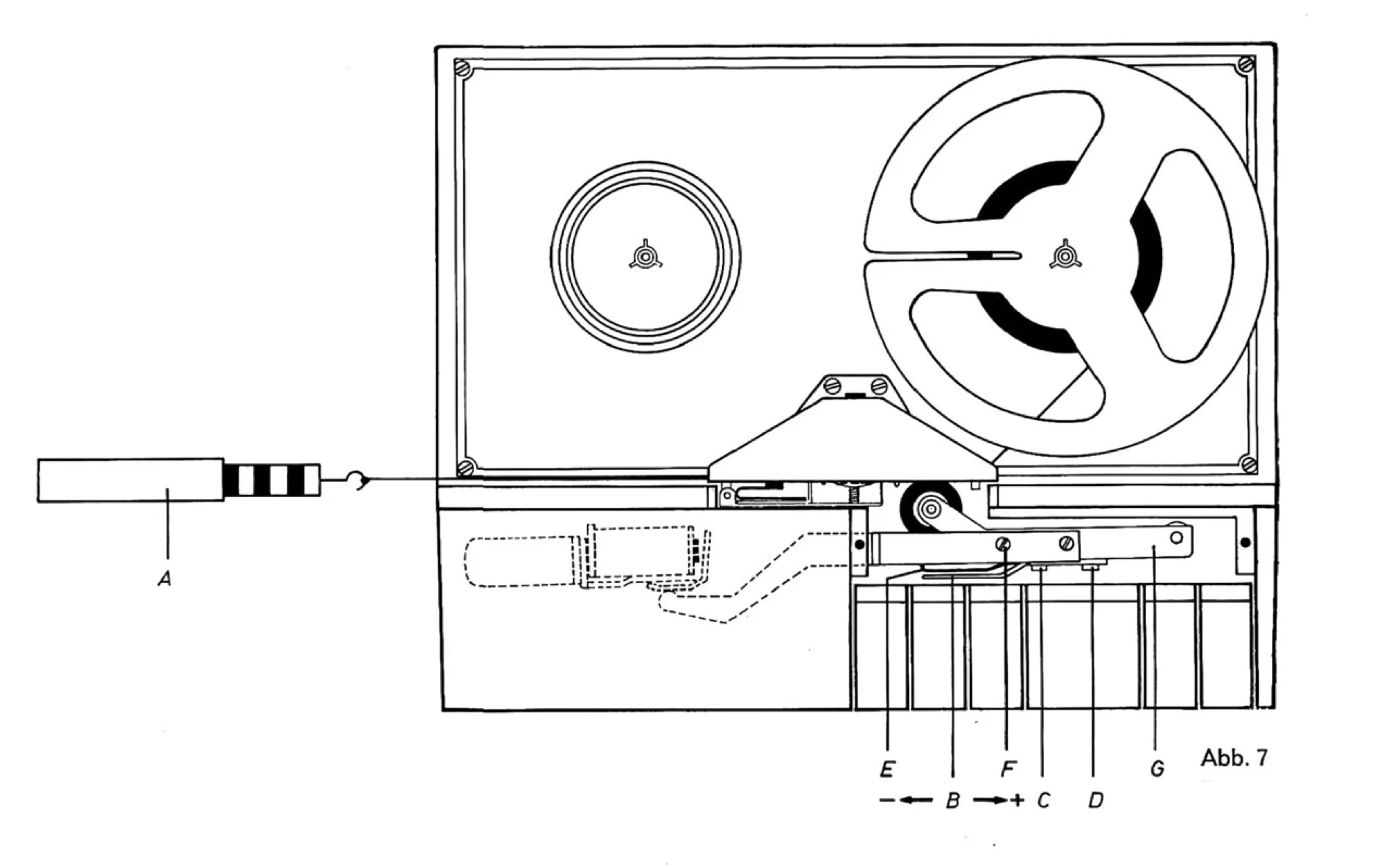 Gegebenenfalls ist das Gestänge zum Stoprelais zu justieren. Dazu wird bei eingelegtem und gestartetem Band die Schraube (F) gelockert, Kontakte 3 und 4 der Buchse „Fernsteuerung" verbunden und durch Schwenken des Andruckarmes (G) ein Abstand von ca. 0,2 mm zwischen Tonwelle und Andruckrolle eingestellt. Anschließend Schraube (F) festziehen und mit Lack sichern.