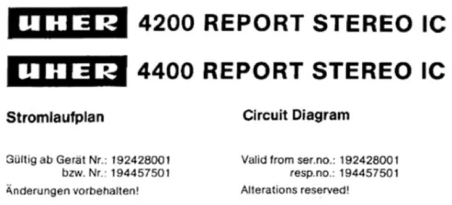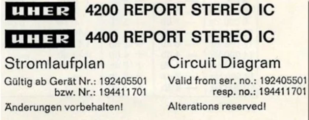 Ein Schaltbild ist für die Service-Arbeiten am UHER Report unerlässlich. Dabei ist es gleichgültig, ob es sich um einen versierten Techniker oder um einen Hobby-Bastler handelt. Der Schaltplan muss korrekt gelesen werden, wenn man die Funktionsweise eines Tonbandgerätes richtig verstehen will. Aber dazu ist natürlich Voraussetzung, dass der Schaltplan auch für den jeweiligen Typ und die Gerätenummer gültig ist. Die Schaltpläne (und die Platinen-Layouts) wurden nämlich im Laufe der Jahre geändert. Daher sollte man zunächst rechts unten auf dem Plan die Gültigkeit der Gerätenummer. Dies z. B. so aus: